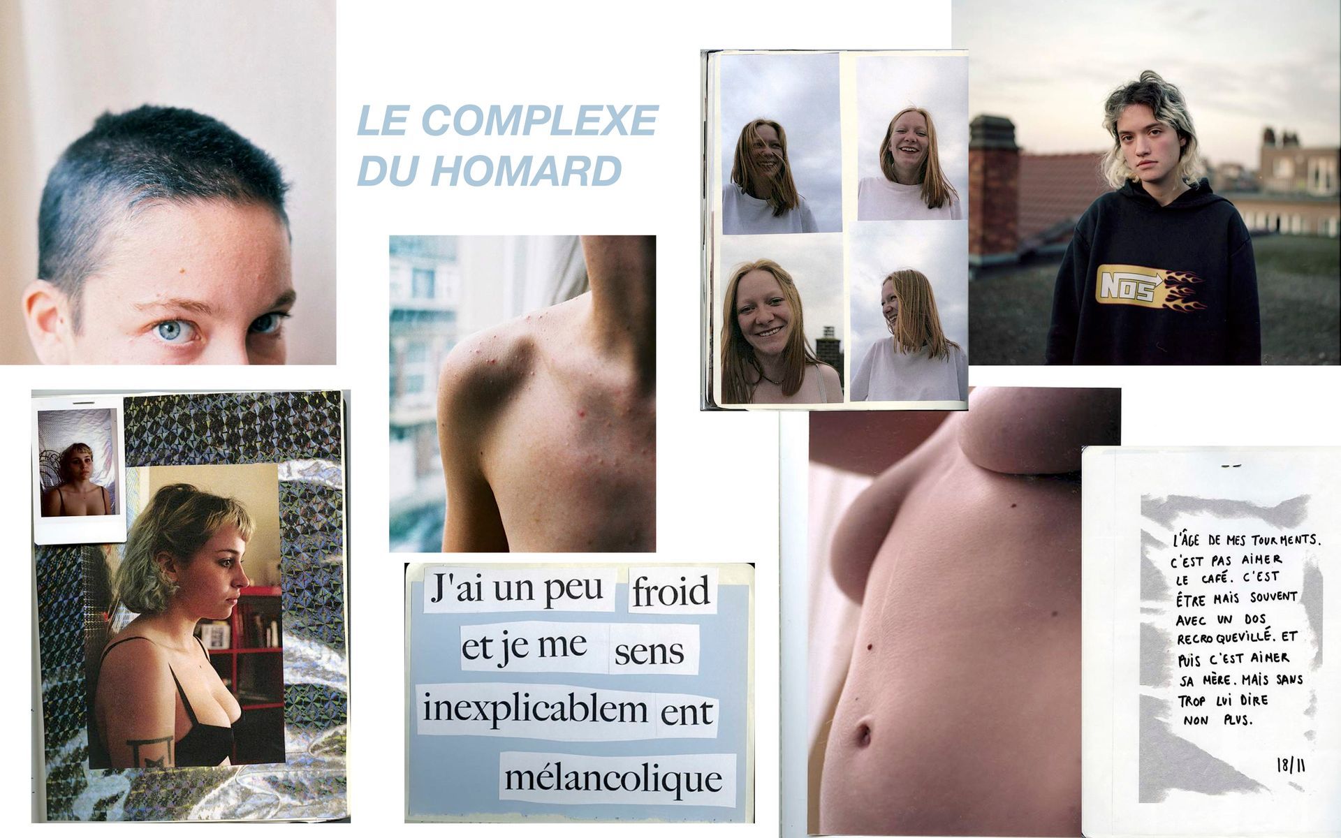 Le complexe du homard est un travail au long cours sur l’adolescence réalisé entre 2012 et 2014 alors que la photographe, Cléo-Nikita Thomasson, entre à peine dans ses vingt ans. Fait de rencontres aléatoires dans la rue et sur les réseaux sociaux, Le complexe du homard (dont le titre est emprunté à Françoise Dolto) consigne ces rencontres dans trois carnets. Travail sur l’autre, mais indirectement introspectif, il témoigne d’une urgence quasi obsessionnelle à enregistrer et conserver cette période vulnérable et éphémère pour en retenir la puissance émotionnelle, la magie, la liberté et documenter la mue des corps, des peurs et des rêves. L’alliance de spontanéité et de maitrise, l’incroyable intimité qui se joue entre la photographe et ses modèles, font la force de cette œuvre, brute et intense dans les images comme dans les textes recueillis en vis-à-vis. La série, composée de plusieurs centaines de portraits, est réalisée en argentique couleur.